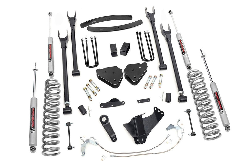 Compliment your 08-10 Ford F-250/350's aggressive, good looks with Rough Country's 4-Link Suspension Lift System. Rough Country's 8-inch Lift Kit was engineered to retain the F-250/350's impressive factory specs while bumping up performance and durability where it's needed most. The result is an aggressive, lifted beast with a mean profile and balanced on and off-road ride quality.\ When changing a vehicle's suspension, the key to preserving ride quality is in keeping the geometry of all suspension components as close to their factory angles as possible. Rough Country's 4-Link Suspension Lift System features a set of ultra-durable radius arm drop brackets, precision fit to bolt right into the factory mounts for an easier install and a more factory-like angle.\ This all-inclusive kit also features an adjustable lower control arms at the axle to allow caster adjustment as well as a track bar relocation bracket and a drop pitman arm. A full set of N3 Shocks provide a truly balanced ride quality for on and off-road use - prefect for daily drivers. This kit also ships with a set of durable, lifted coil springs and brake line relocation brackets.\ This innovative kit design features a 100% bolt-on installation process that is lightning fast compared to other kits this size. Save time and money with no need for cutting, drilling, or other complicated procedures. Rough Country's Rough Country's 4-Link Suspension Lift System is backed by our Lifetime Replacement Warranty.