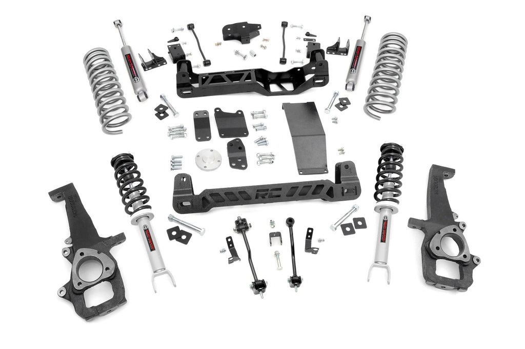 Aggressive Stance, Unmatched Strength: Transform your RAM 1500 with Rough Country's 6-Inch Suspension Lift, built for bold style, improved capability, and a commanding stance. This premium system levels the front and rear for a clean, aggressive profile and supports up to 37-inch tires, giving you the clearance to conquer rugged terrain with confidence.Engineered for the Extreme: This all-inclusive kit features laser-cut steel components, high-clearance front and rear crossmembers, and heavy-duty lifted knuckles, crafted for precision, strength, and perfect suspension geometry. A durable skid plate provides essential protection for the front differential, making this kit trail-ready and rock-solid from the ground up.Ride in Comfort, Perform with Confidence: Rough Country's nitrogen-charged N3 rear shocks come standard, delivering smooth, controlled damping whether you're cruising highways or crawling trails. Want even more performance? Upgrade with optional N3 Loaded Struts for enhanced handling, pre-loaded coils for easier installation, and a ride quality that stays plush no matter the road.Built to Go the Distance: Whether it's off-road excursions or everyday driving, this kit preserves your RAM's factory ride while boosting ground clearance and protection. Backed by Rough Country's Limited Lifetime Replacement Guarantee, this lift is your next-level suspension solution.
