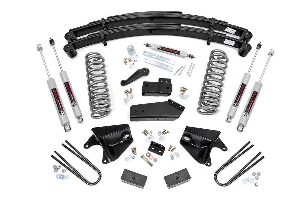 Level Up Your Stance and Style: Give your 1980-1996 Ford F-150 or Bronco a bold, aggressive look from front to rear with Rough Country's 6" Suspension Lift Kit. This easy-to-install system levels the front with the rear, eliminating the factory rake for a clean, balanced profile and commanding presence on and off the road.Improved Ground Clearance and Ride Quality: Featuring durable front coil springs, this kit delivers increased ground clearance while maintaining excellent ride comfort and performance. Precision-engineered radius arm and axle drop brackets ensure all components stay in optimal alignment, preserving that factory-like ride feel after the lift.Premium Components for Maximum Durability: The fabricated rear lift blocks included in this kit are built tougher than standard cast iron blocks, offering greater strength and long-term reliability, perfect for heavy-duty applications and rugged use. This kit also includes add-a-leaf springs, providing an extra boost in rear support and load-carrying capacity while maintaining overall ride quality.Performance-Tuned N3 Shock Absorbers: Enjoy a superior blend of off-road performance and on-road comfort with Rough Country's nitrogen-charged N3 shocks. These high-pressure shocks feature a 10-stage variable valving system, a durable 18mm spring-loaded piston rod, and a fast-cooling 54mm shock body for consistent performance in any condition.Upgrade Options for Added Strength: This lift is available with optional replacement rear leaf springs, giving you the flexibility to enhance your load capacity and rear suspension performance as needed.Room for 35-Inch Tires: Rough Country's 6" Lift Kit gives you the clearance to run up to 35" tall tires, transforming your Ford's capability and stance with the aggressive look you want.Backed by a Limited Lifetime Warranty: Enjoy peace of mind knowing your investment is protected by Rough Country's Limited Lifetime Replacement Warranty.