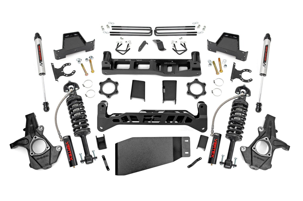 Go Big with Confidence: Rough Country's 7.5-inch Suspension Lift Kit for your Chevy Silverado 1500/GMC Sierra 1500 delivers towering ride height, aggressive stance, and the clearance to run 35-inch tires all while using your factory 20-inch wheels. No wheel upgrades needed to dominate the trails.Clean, Level Stance from Front to Rear: Say goodbye to factory rake. This lift kit achieves a balanced, level profile that looks just as tough as it performs, giving your truck a commanding presence on and off the road.Engineered for Ground-Clearing Performance: Our signature high-clearance crossmembers feature a low-profile design with the iconic "RC" logo, giving you maximum ground clearance and trail-readiness. A heavy-duty lower skid plate and precision-engineered sway-bar and differential drop brackets further enhance durability and protection.Install Made Easy No Cutting Required: Designed with convenience in mind, this kit requires zero drivetrain, exhaust, or differential modifications. Even better, there's no need to disassemble your struts making installation faster and smoother than traditional lift systems.Durability You Can Depend On: All components are precision laser-cut using advanced CAD technology, ensuring an exact fit and rock-solid durability. The included rear 6.5-inch heavy-duty fabricated lift blocks are stronger and more reliable than standard cast options and feature anti-wrap technology to preserve your factory ride quality.Customize Your Ride: This kit is fully compatible with your choice of Rough Country shock and strut options from our value-packed, nitrogen-charged N3s to the high-performance Vertex reservoir series. Get the ride feel and performance that matches your driving style.