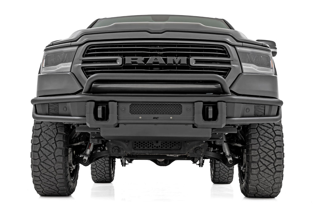 Take your truck's off-road capability and style to the next level with this rugged, trail-ready upgrade. Built for performance and designed to turn heads, this bumper is ready for any adventure.Sleek & Bold Design: Constructed with durable 2-inch diameter tubing and finished in a corrosion-resistant Satin Black coating, this bumper delivers a bold, aggressive look that complements your Ram 1500's rugged stance.Trail-Ready Strength: Equipped with a heavy-duty D-ring set boasting a massive 4.75-ton capacity, this bumper provides reliable recovery points for your toughest adventures.Ultimate Off-Road Protection: An integrated skid plate shields vital components from rocks, debris, and rough terrain, while the bolt-on stinger bar enhances front-end protection and style.Built-In Light Bar Mount: The stinger bar isn't just for protection - it also functions as a sturdy mount for an LED light bar, giving you the flexibility to enhance nighttime visibility on the trails.With bold styling, unbeatable strength, and essential off-road features, Rough Country's Front Tubular Bumper is the game-changing upgrade your Ram 1500 deserves. Ditch the stock look and conquer the trails with confidence!