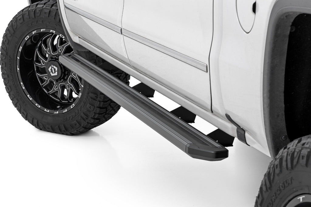 Revolutionize the way you step into your truck with Rough Country's Bluetooth-Controlled Running Boards! Designed for those who demand both cutting-edge technology and rugged durability, these premium running boards combine wireless convenience, customizable LED lighting, and rock-solid construction into one sleek package. Whether you're looking for enhanced accessibility, extra protection, or a bold new look, these running boards deliver the perfect blend of functionality and style-all at the touch of a button.Wireless Control at Your Fingertips: Step into the future with Bluetooth-controlled running boards that offer seamless access and fully customizable LED lighting. With a simple app-based control, you can adjust step settings and personalize lighting effects effortlessly.Built Tough with Premium Aluminum: Designed for durability, these one-piece aluminum running boards are lightweight, corrosion-resistant, and ready for any terrain. The sleek cab-length design provides full coverage while protecting your truck from road debris and rock chips.Custom Lighting Like Never Before: Express your style with 234 color options, 12 dynamic effects, and five preset color saves. The integrated LED strip and RC puddle lights enhance visibility for safer nighttime entry and exit, while the adjustable step lighting lets you set the perfect delay from 1 second to 10 minutes.Seamless Fit for Any Setup: Whether your truck has a body lift or not, these running boards are engineered for a perfect fit. The sleek frame coverage also conceals exposed components for a clean, factory-like finish.Easy, Bolt-On Installation: No need for complex modifications-these running boards feature a hassle-free, drill-free installation so you can get back on the road fast. Designed for convenience, strength, and style, they're the ultimate upgrade for your truck.Backed by Rough Country's Leading Warranty: With a Limited Lifetime Warranty, these running boards are built to last. Whether you're hitting the trails or cruising the streets, you'll have peace of mind knowing your investment is protected.